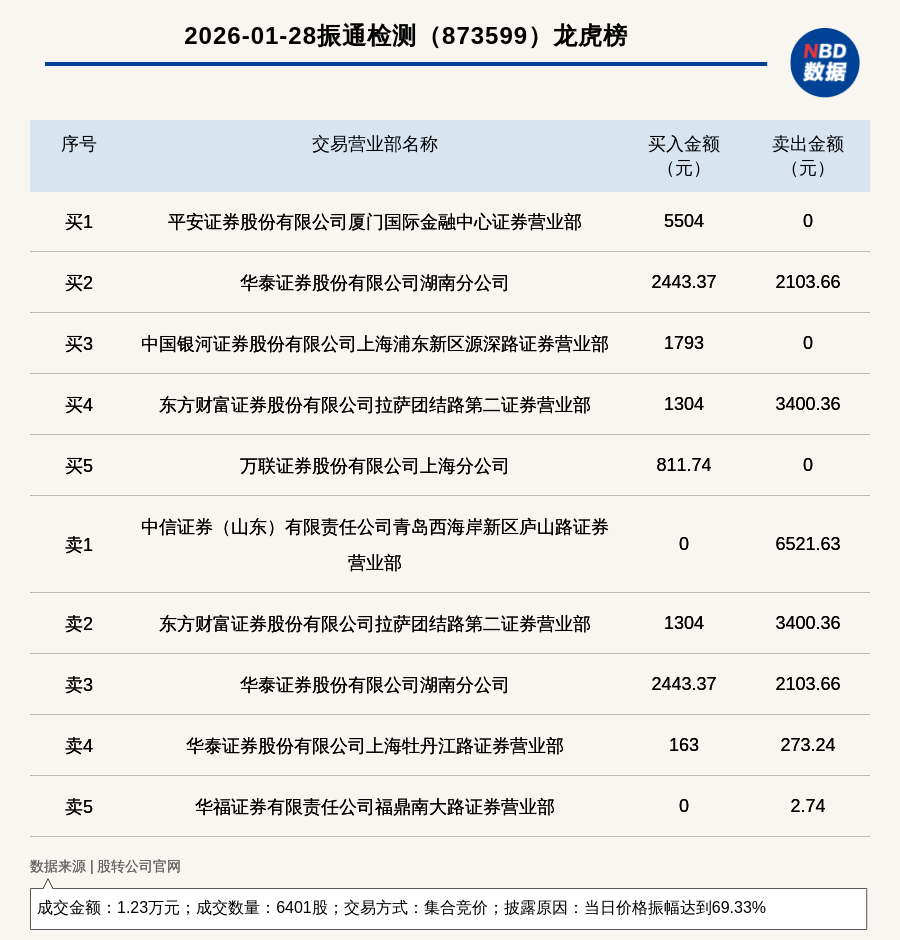 每经讯,2026年1月28日,新三板创新层公司振通检测(873599,收盘价:2.34元)登上龙虎榜,交易方式是集合竞价,披露原因是当日价格振幅达到69.33%,成交数量6401股,成交金额1.23万元。买一席位为平安证券股份有限公司厦门国际金融中心证券营业部,买入5504元;卖一席位为中信证券(山东)有限责任公司青岛西海岸新区庐山路证券营业部,卖出6521.63元。
