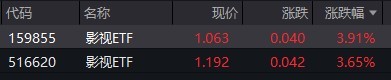 受盘面影响,影视ETF涨超3%。