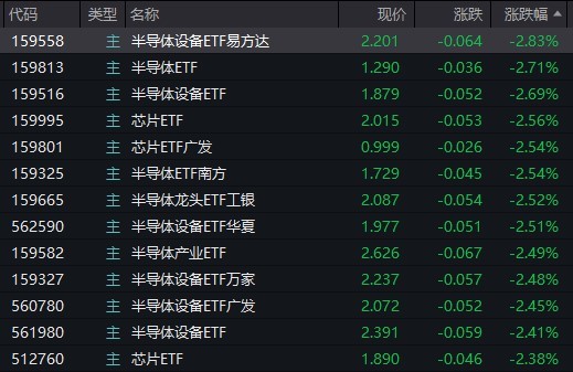 受盘面影响,芯片、半导体相关ETF跌超2%。