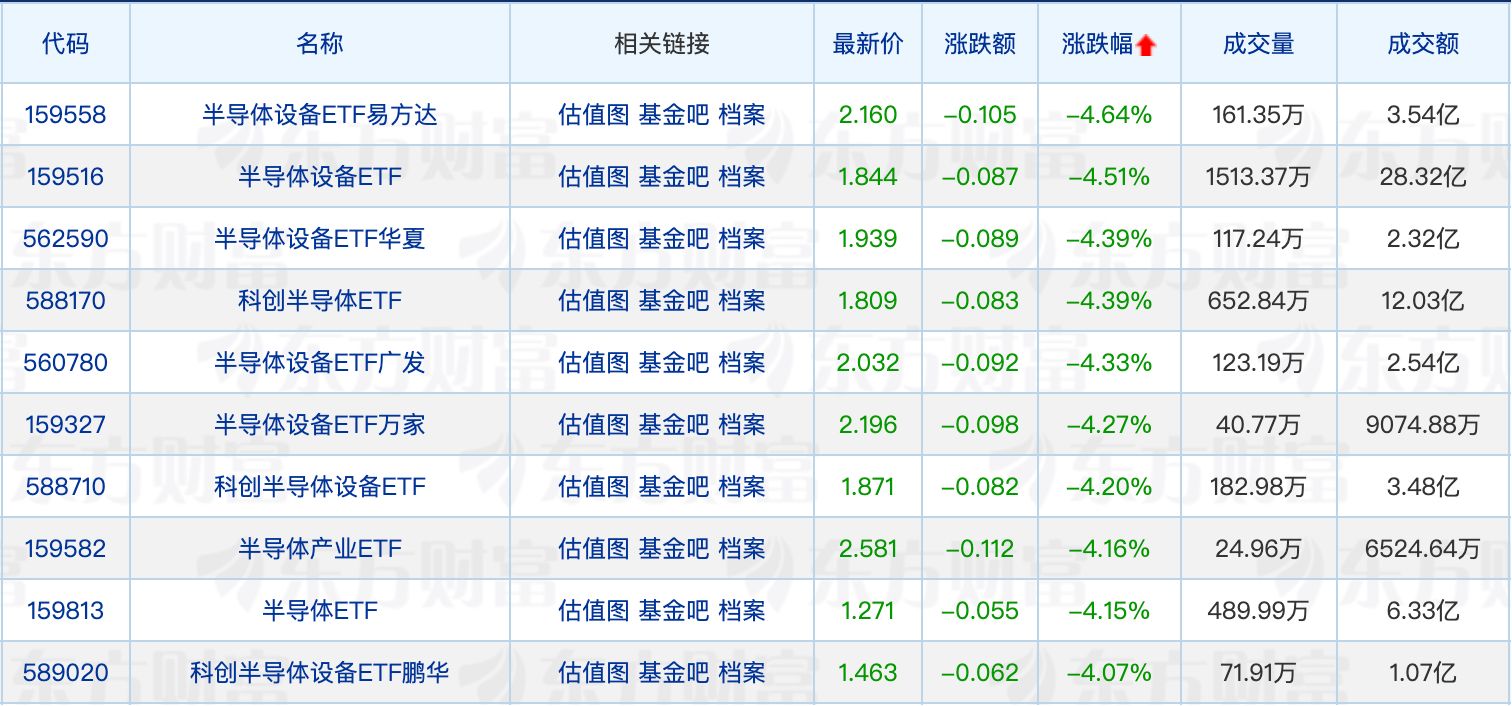 下跌方面,半导体设备ETF全线回调,最大跌幅为4.64%。