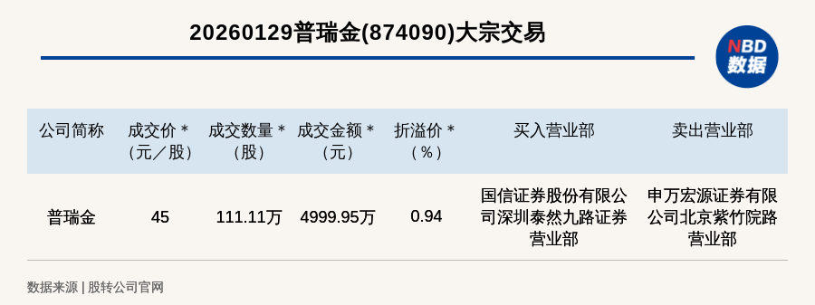 每经讯,2026年1月29日,新三板创新层公司普瑞金(874090,收盘价:44.58元)发生一笔大宗交易,成交价45元/股,成交数量111.11万股,成交金额4999.95万元,溢价0.94%。买入营业部是国信证券股份有限公司深圳泰然九路证券营业部,卖出营业部是申万宏源证券有限公司北京紫竹院路营业部。