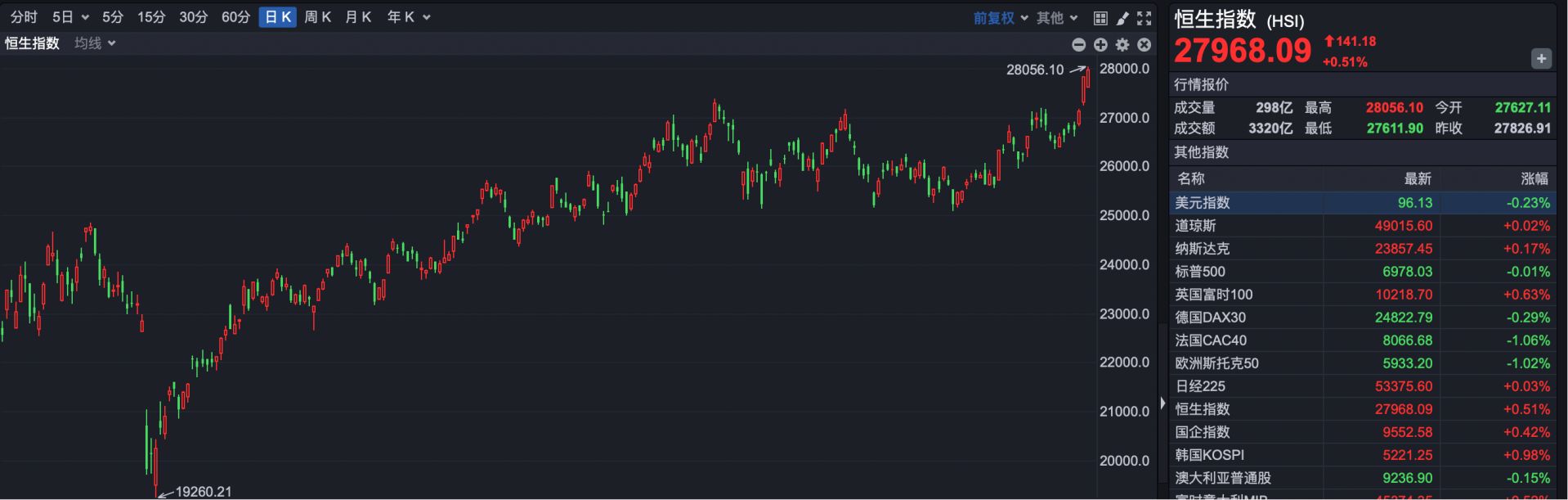 1月29日,港股市场维持上涨,恒指盘中一度突破28000点大关,最高报28056.10点。