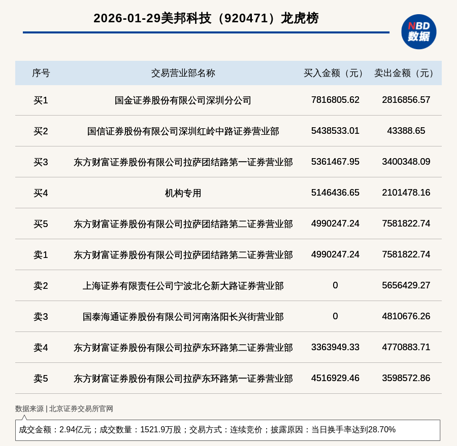 每经讯,2026年1月29日,北交所上市公司美邦科技(920471,收盘价:20.68元)登上龙虎榜,交易方式是连续竞价,披露原因是当日换手率达到28.70%,成交数量1521.9万股,成交金额2.94亿元。买一席位为国金证券股份有限公司深圳分公司,买入781.68万元;卖一席位为东方财富证券股份有限公司拉萨团结路第二证券营业部,卖出758.18万元。