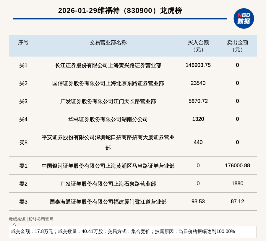 每经讯,2026年1月29日,新三板基础层公司维福特(830900,收盘价:0.88元)登上龙虎榜,交易方式是集合竞价,披露原因是当日价格振幅达到100.00%,成交数量40.41万股,成交金额17.8万元。买一席位为长江证券股份有限公司上海黄兴路证券营业部,买入14.69万元;卖一席位为中国银河证券股份有限公司上海黄浦区马当路证券营业部,卖出17.6万元。