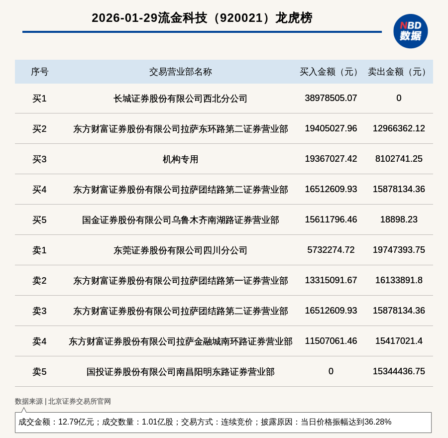 每经讯,2026年1月29日,北交所上市公司流金科技(920021,收盘价:13元)登上龙虎榜,交易方式是连续竞价,披露原因是当日价格振幅达到36.28%,成交数量1.01亿股,成交金额12.79亿元。买一席位为长城证券股份有限公司西北分公司,买入3897.85万元;卖一席位为东莞证券股份有限公司四川分公司,卖出1974.74万元。