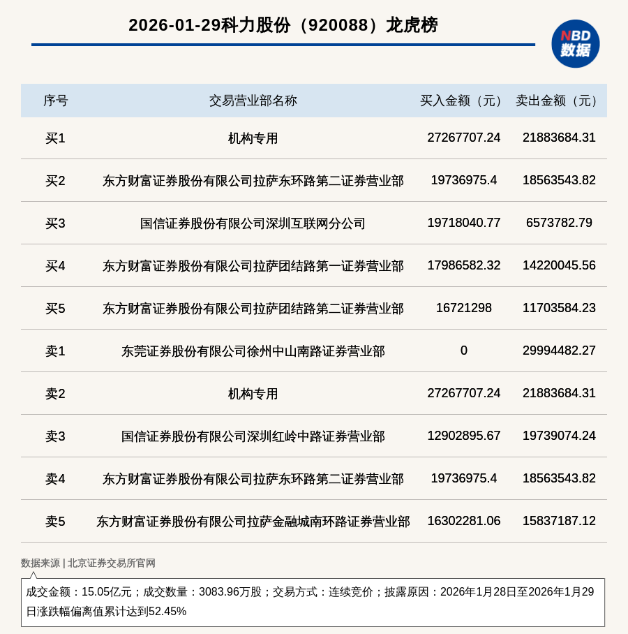 每经讯,2026年1月29日,北交所上市公司科力股份(920088,收盘价:60.51元)登上龙虎榜,交易方式是连续竞价,披露原因是2026年1月28日至2026年1月29日涨跌幅偏离值累计达到52.45%,成交数量3083.96万股,成交金额15.05亿元。买一席位为机构专用,买入2726.77万元;卖一席位为东莞证券股份有限公司徐州中山南路证券营业部,卖出2999.45万元。
