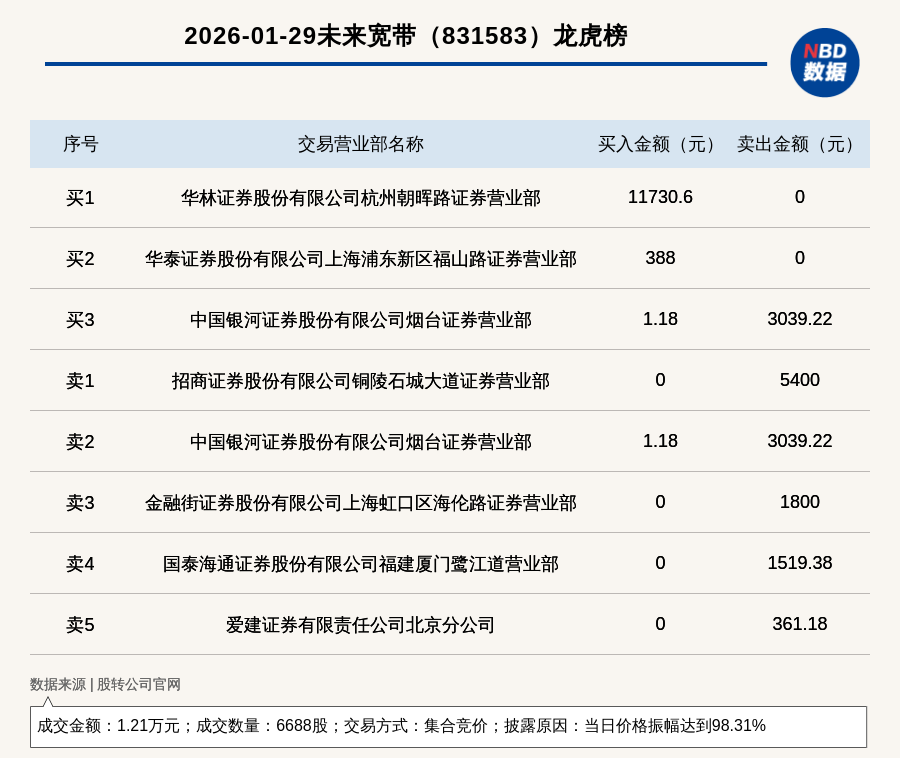 每经讯,2026年1月29日,新三板创新层公司未来宽带(831583,收盘价:2.34元)登上龙虎榜,交易方式是集合竞价,披露原因是当日价格振幅达到98.31%,成交数量6688股,成交金额1.21万元。买一席位为华林证券股份有限公司杭州朝晖路证券营业部,买入1.17万元;卖一席位为招商证券股份有限公司铜陵石城大道证券营业部,卖出5400元。