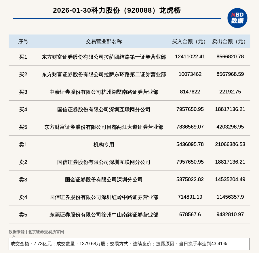 每经讯,2026年1月30日,北交所上市公司科力股份(920088,收盘价:51.8元)登上龙虎榜,交易方式是连续竞价,披露原因是当日换手率达到43.41%,成交数量1379.68万股,成交金额7.73亿元。买一席位为东方财富证券股份有限公司拉萨团结路第一证券营业部,买入1241.1万元;卖一席位为机构专用,卖出2106.64万元。