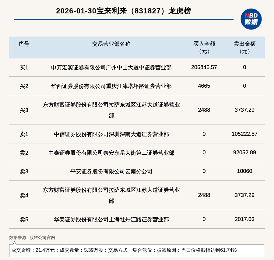 每经讯,2026年1月30日,新三板创新层公司宝来利来(831827,收盘价:3.11元)登上龙虎榜,交易方式是集合竞价,披露原因是当日价格振幅达到61.74%,成交数量5.39万股,成交金额21.4万元。买一席位为申万宏源证券有限公司广州中山大道中证券营业部,买入20.68万元;卖一席位为中信证券股份有限公司深圳深南大道证券营业部,卖出10.52万元。