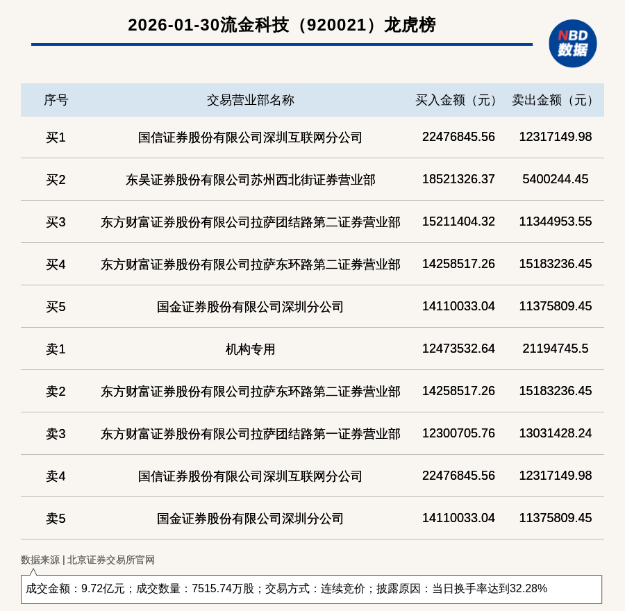 每经讯,2026年1月30日,北交所上市公司流金科技(920021,收盘价:13.1元)登上龙虎榜,交易方式是连续竞价,披露原因是当日换手率达到32.28%,成交数量7515.74万股,成交金额9.72亿元。买一席位为国信证券股份有限公司深圳互联网分公司,买入2247.68万元;卖一席位为机构专用,卖出2119.47万元。