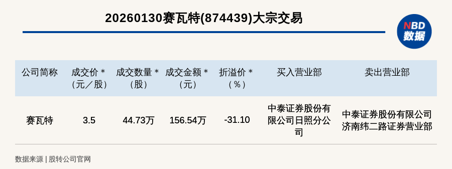每经讯,2026年1月30日,新三板创新层公司赛瓦特(874439,收盘价:5.08元)发生一笔大宗交易,成交价3.5元/股,成交数量44.73万股,成交金额156.54万元,折价31.1%。买入营业部是中泰证券股份有限公司日照分公司,卖出营业部是中泰证券股份有限公司济南纬二路证券营业部。