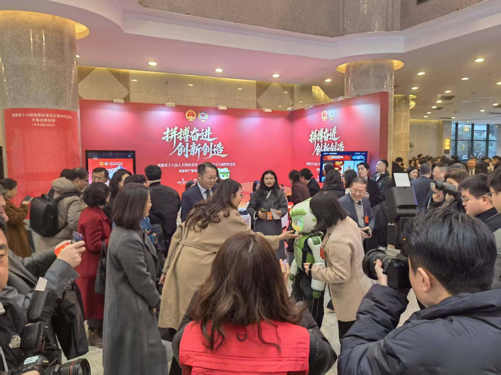 1月28日,成都两会现场,一个热情好客、善于交流的“小话痨”——“爱湫”机器人,自如地与参会嘉宾互动。