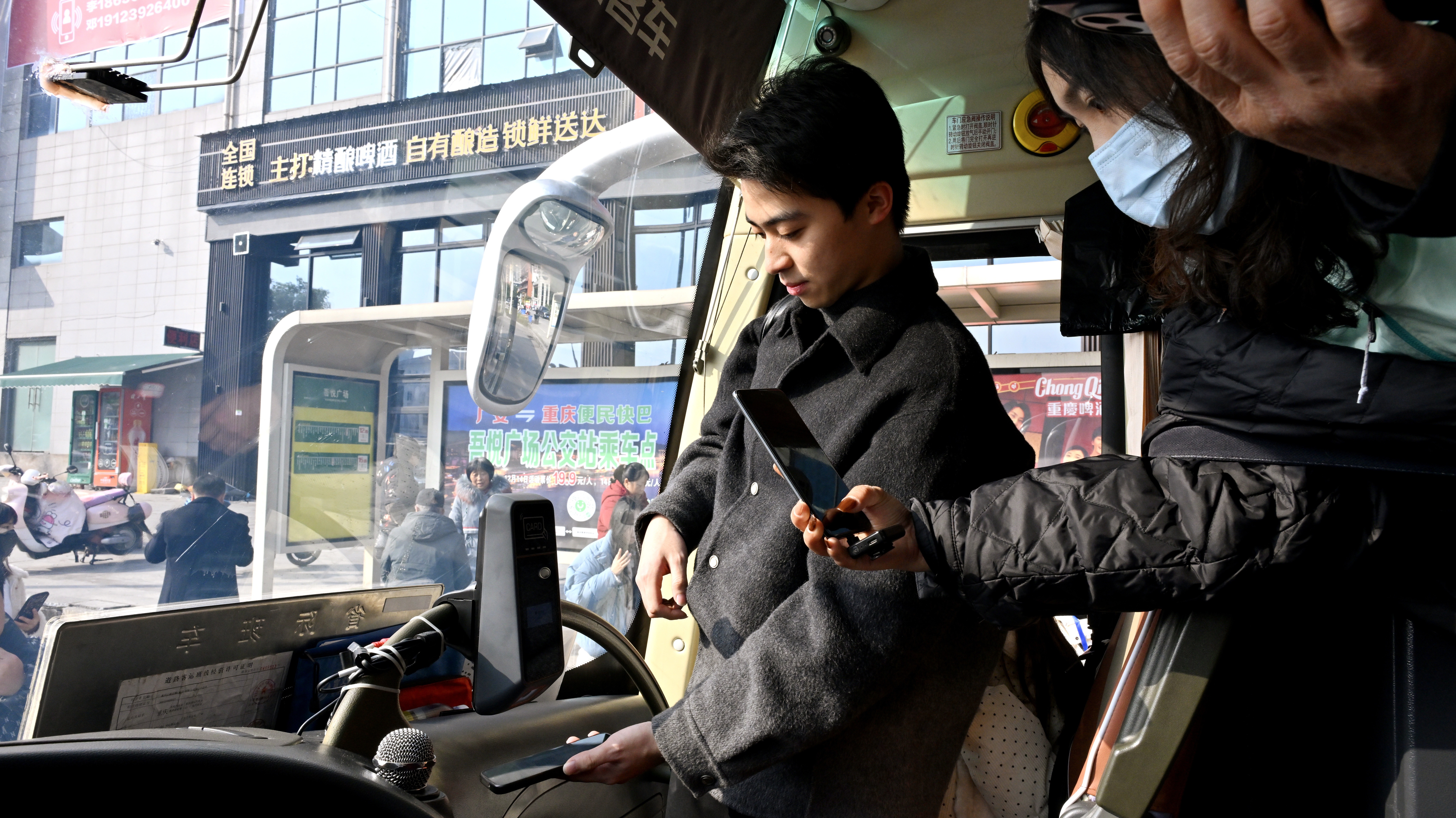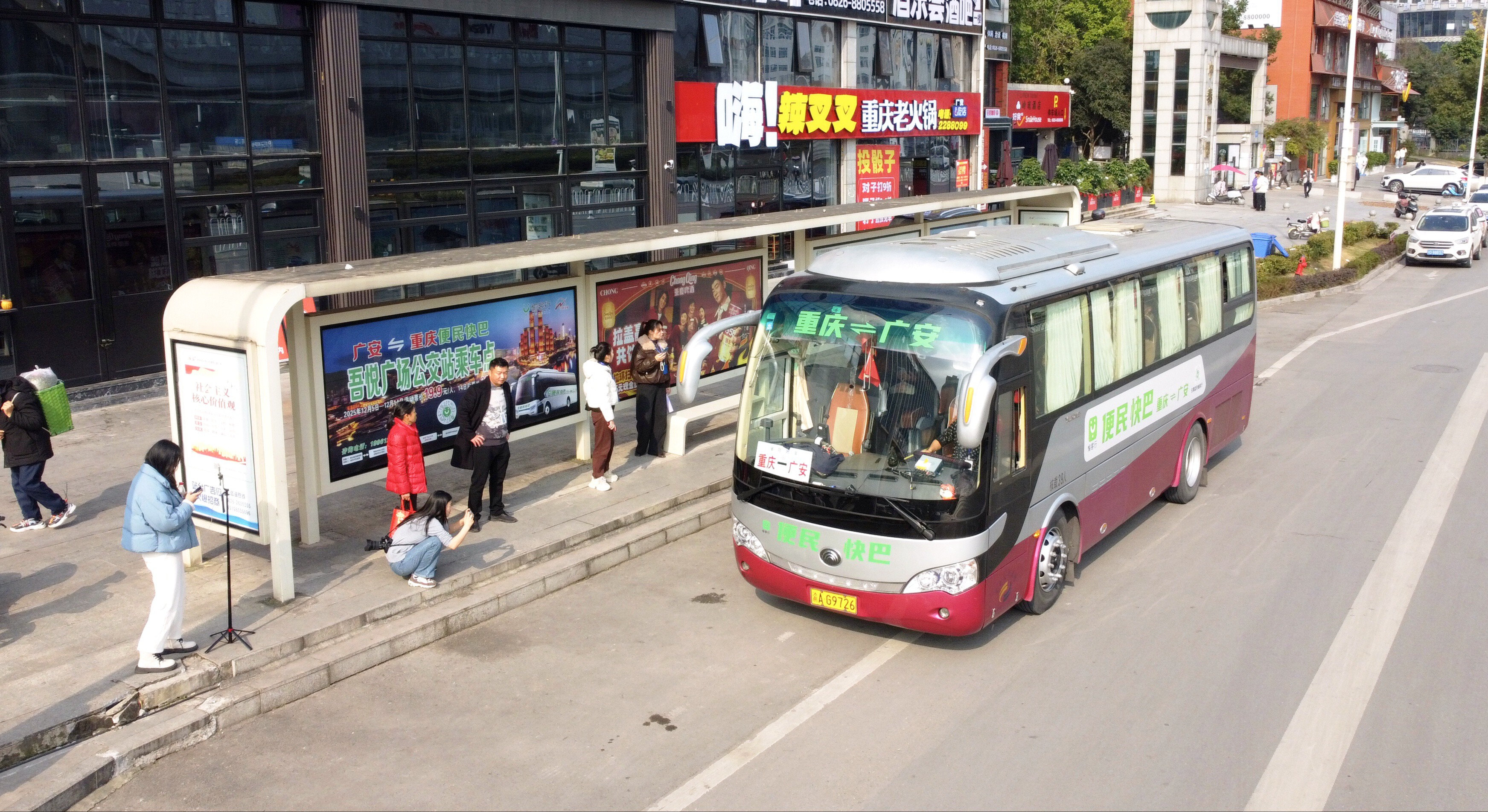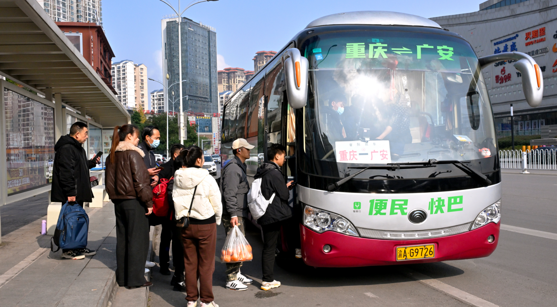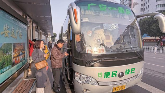 1月27日上午9时10分,广安三中公交站台。一辆绿字标识的“广安⇌重庆”便民快巴稳稳停靠。近10位乘客拎包提袋,在冬日暖阳下有序排队。