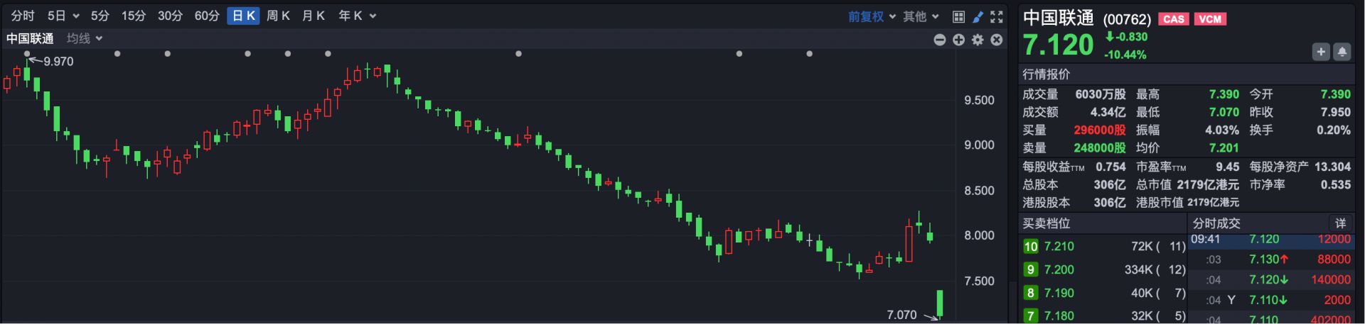 市场焦点方面,三大电信运营商集体大跌。其中,中国联通(HK00762)跌超10%,中国移动(HK00941)跌超4%,中国电信(HK00728)跌超8%。