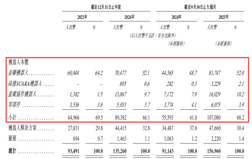 按产品及解决方案类型划分,2023年、2024年和2025年前三季度(以下简称“报告期内”),阿童木机器人的主要收入来自机器人本体(包括并联机器人、高速SCARA机器人、重载协作机器人和零部件),收入占比分别为69.5%、66.1%和68.2%,其中并联机器人占公司各年/期总收入的比例分别为64.2%、52.1%和52%。