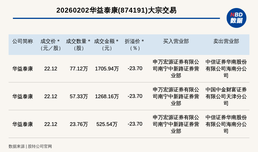 每经讯,2026年2月2日,新三板创新层公司华益泰康(874191,收盘价:28.99元)发生3笔大宗交易,总成交金额为3499.64万元,成交金额最高的一笔成交价22.12元/股,成交数量77.12万股,成交金额1705.94万元,折价23.7%。买入营业部是申万宏源证券有限公司南宁中新路证券营业部,卖出营业部是中信证券华南股份有限公司海南分公司。
