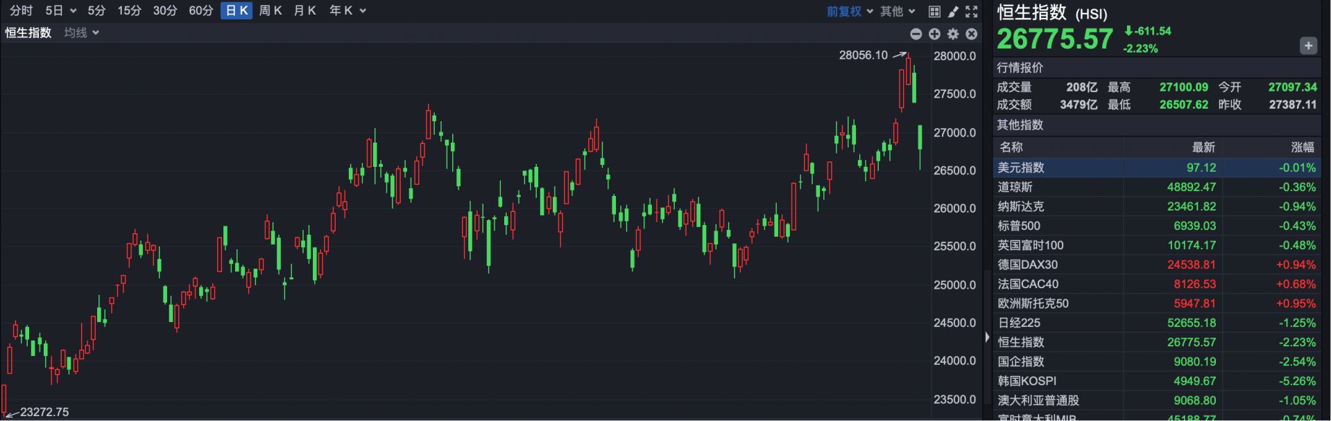 截至收盘,恒生指数报收26775.57点,下跌611.54点,跌幅2.23%。