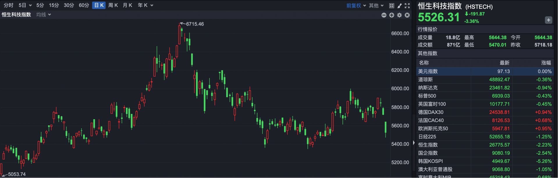 恒生科技指数报收5526.31点,下跌191.87点,跌幅3.36%。