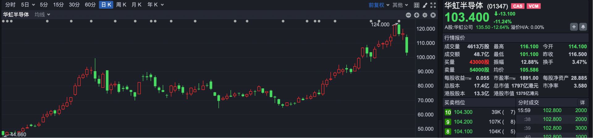 芯片股方面,华虹半导体跌超11%。