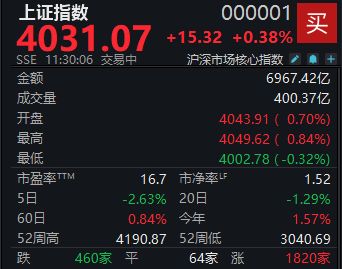 2月3日,A股震荡攀升,截至上午收盘,上证指数涨0.38%报4031.07点,深证成指涨0.93%,创业板指涨0.76%,北证50涨2.16%,科创50跌0.27%,中证A500涨0.65%。A股半日成交额1.62万亿元。