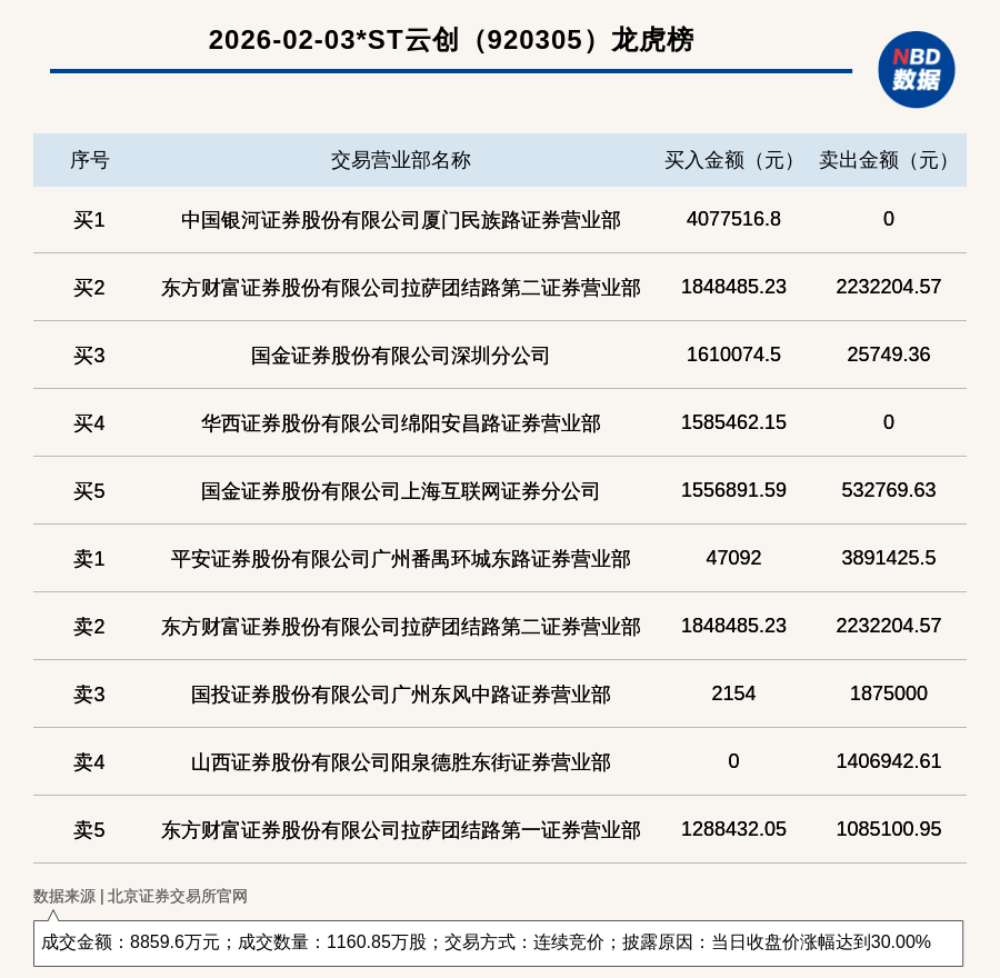 每经讯,2026年2月3日,北交所上市公司*ST云创(920305,收盘价:8.06元)登上龙虎榜,交易方式是连续竞价,披露原因是当日收盘价涨幅达到30.00%,成交数量1160.85万股,成交金额8859.6万元。买一席位为中国银河证券股份有限公司厦门民族路证券营业部,买入407.75万元;卖一席位为平安证券股份有限公司广州番禺环城东路证券营业部,卖出389.14万元。