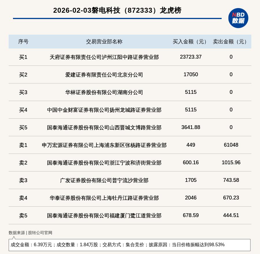 每经讯,2026年2月3日,新三板创新层公司磐电科技(872333,收盘价:3.5元)登上龙虎榜,交易方式是集合竞价,披露原因是当日价格振幅达到98.53%,成交数量1.84万股,成交金额6.39万元。买一席位为天府证券有限责任公司泸州江阳中路证券营业部,买入2.37万元;卖一席位为申万宏源证券有限公司上海浦东新区张杨路证券营业部,卖出6.1万元。