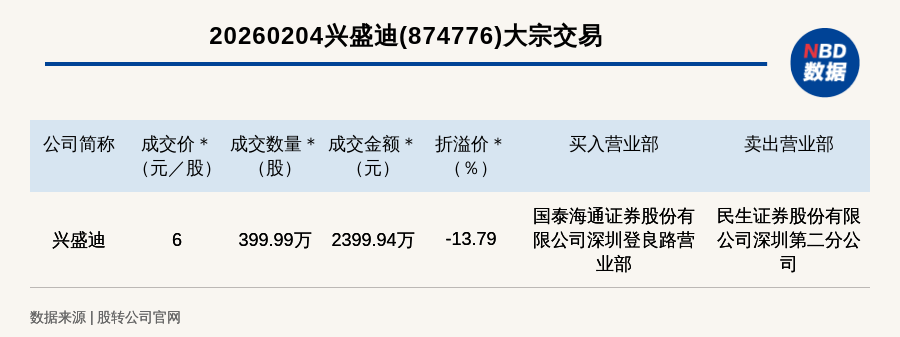 每经讯,2026年2月4日,新三板基础层公司兴盛迪(874776,收盘价:6.96元)发生一笔大宗交易,成交价6元/股,成交数量399.99万股,成交金额2399.94万元,折价13.79%。买入营业部是国泰海通证券股份有限公司深圳登良路营业部,卖出营业部是民生证券股份有限公司深圳第二分公司。