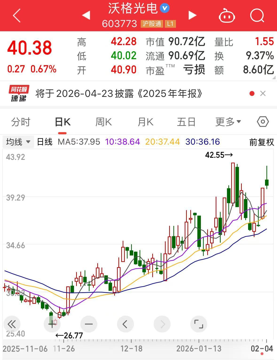 盘面上,截至收盘,沃格光电股价涨0.67%,最新报40.38元,市值90.72亿元。