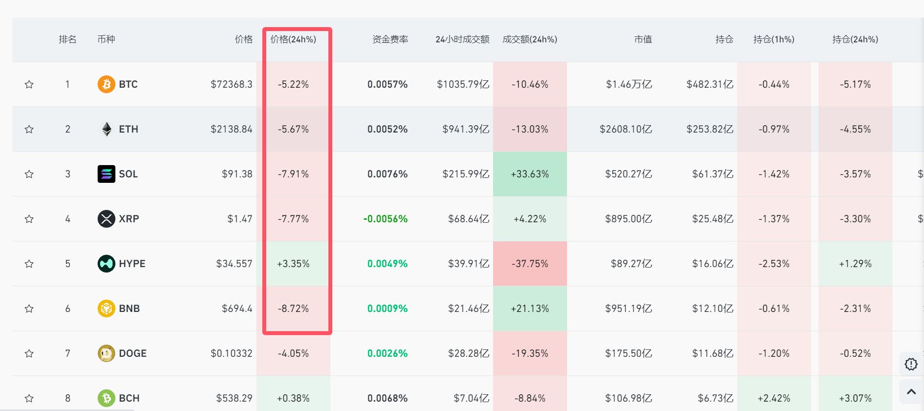 此外,比特币引领的抛售潮加速,加密货币主要币种持续下挫,截至发稿,比特币跌超5%报72646美元/枚,SOL重挫逾7%,ETH跌超5%。