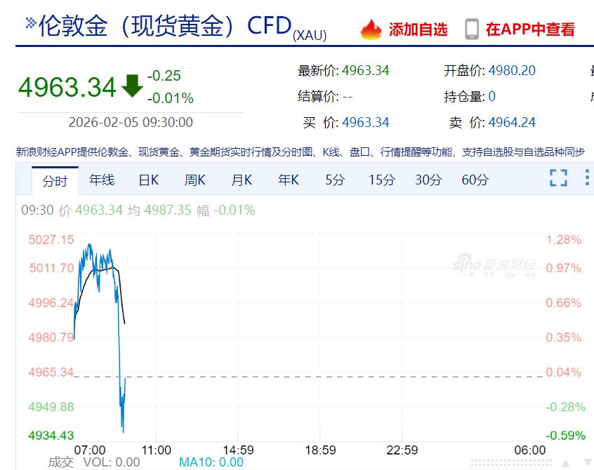 截至发稿,现货黄金回落至4970美元/盎司下方,日内跌0.01%。