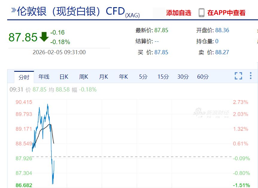现货白银跌破88美元/盎司,日内跌0.18%。
