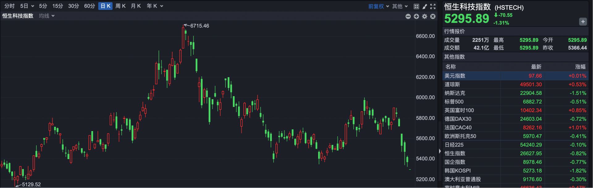 恒生科技指数开盘报5295.89点,下跌70.55点,跌幅1.31%。