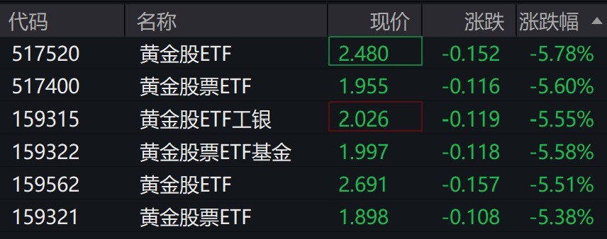 受盘面影响,黄金股相关ETF跌超5%。