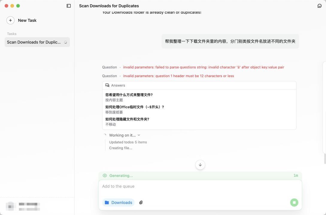 记者首先测试了文字工作者高频使用的基础文件管理能力,向QoderWork下达指令,要求清理“下载”文件夹中的重复文件。QoderWork能够自动扫描并识别重复内容,并在较短时间内完成删除操作,过程中无需人工干预。