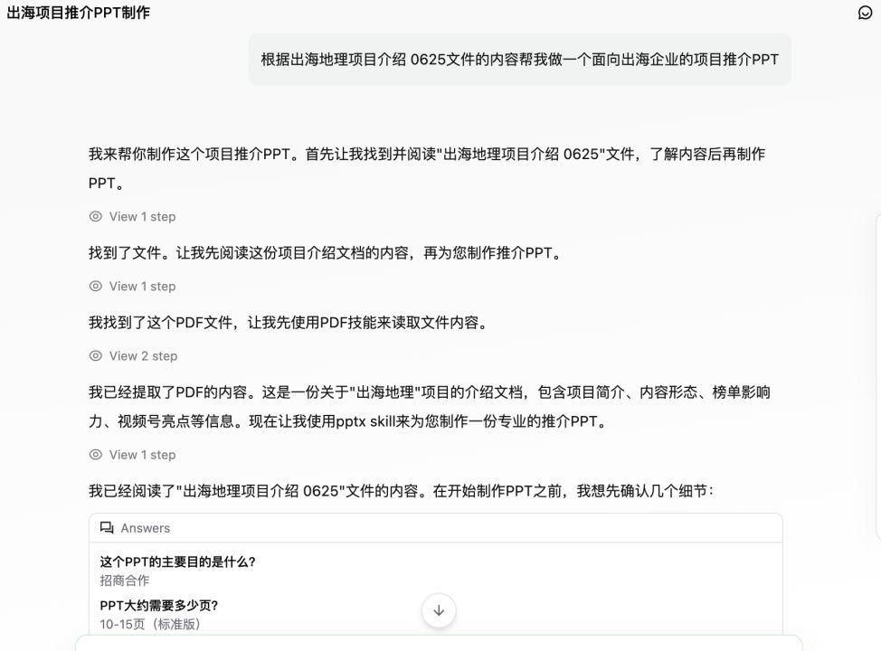 在内容创作能力测试中,记者要求QoderWork基于指定文件夹内的素材制作一份PPT。相关素材以自然语言形式提供,包含文字版PDF内容。QoderWork采用JavaScript将HTML转换为PPT文件,任务顺利完成,生成过程稳定。