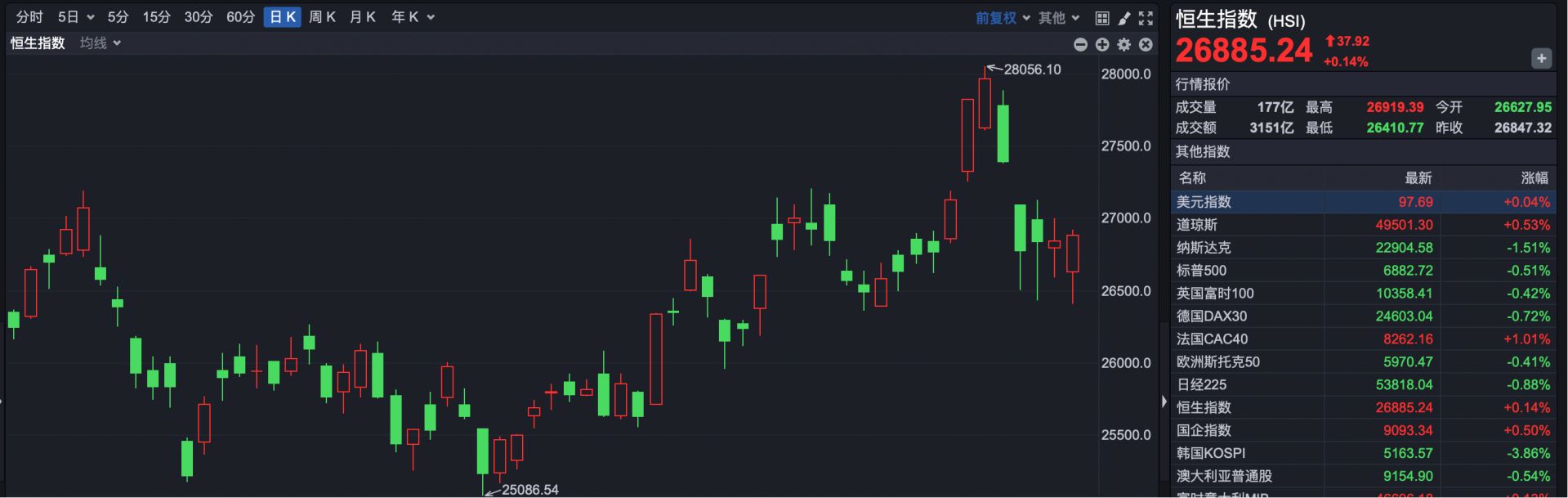 恒生指数今日一度跌超1.6%,最终收盘报26885.24点,上涨37.92点,涨幅0.14%。