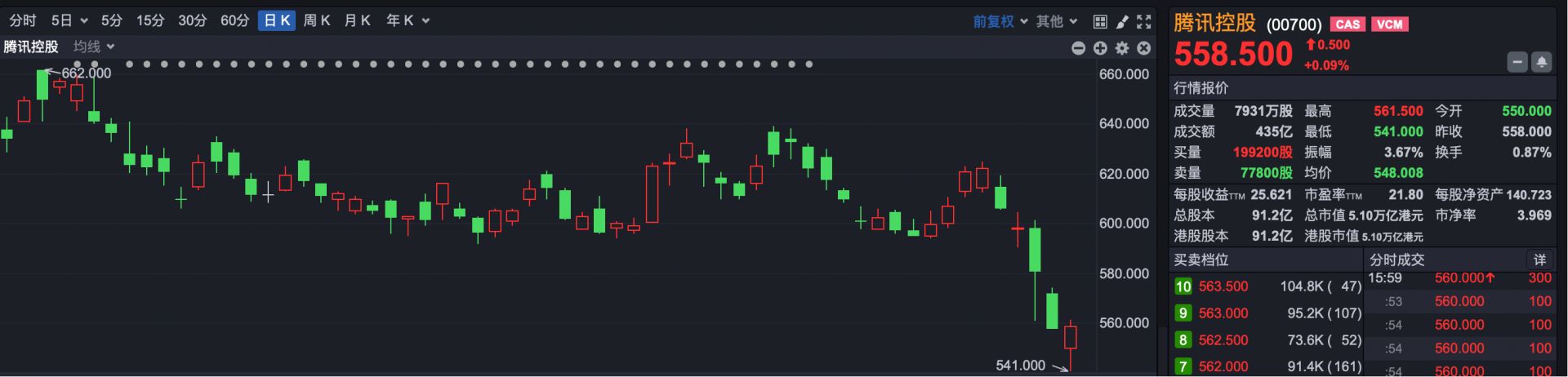 市场焦点方面,腾讯控股(HK00700)近期持续回落,今日一度跌超3%,本月以来最大累计跌幅超过10%。不过午后强势回升,最终收盘报558.5港元,微涨0.09%。