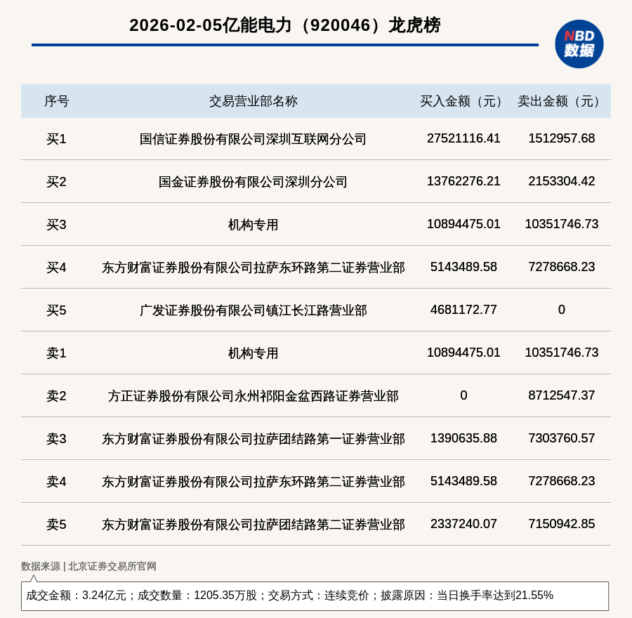 每经讯,2026年2月5日,北交所上市公司亿能电力(920046,收盘价:26.31元)登上龙虎榜,交易方式是连续竞价,披露原因是当日换手率达到21.55%,成交数量1205.35万股,成交金额3.24亿元。买一席位为国信证券股份有限公司深圳互联网分公司,买入2752.11万元;卖一席位为机构专用,卖出1035.17万元。