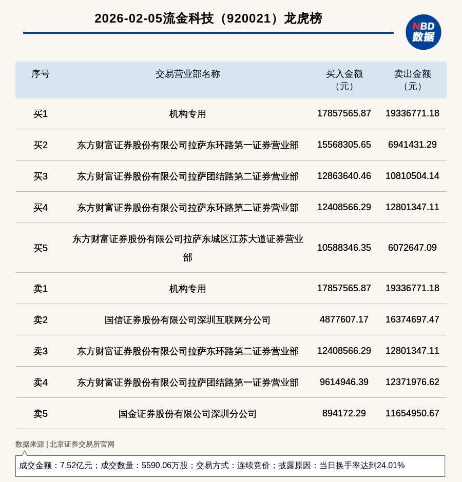 每经讯,2026年2月5日,北交所上市公司流金科技(920021,收盘价:13.33元)登上龙虎榜,交易方式是连续竞价,披露原因是当日换手率达到24.01%,成交数量5590.06万股,成交金额7.52亿元。买一席位为机构专用,买入1785.76万元;卖一席位为机构专用,卖出1933.68万元。