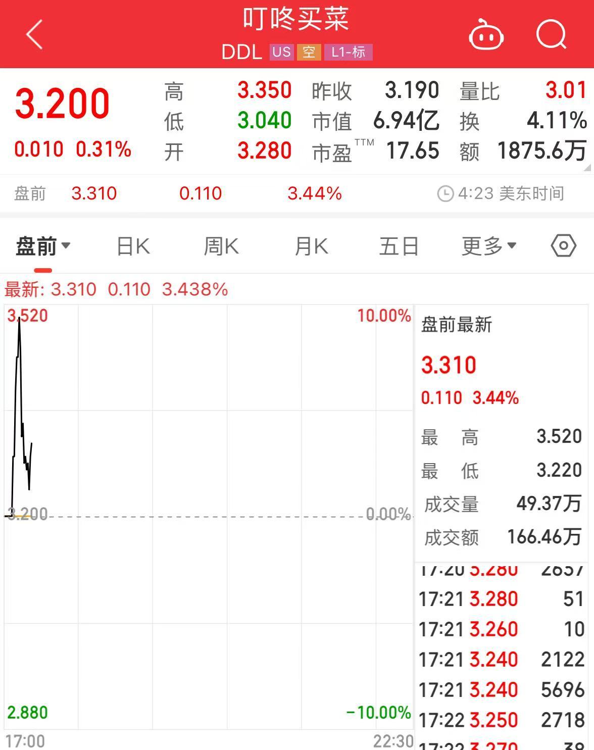 盘面上,叮咚买菜美股盘前一度直线拉升涨近10%。截至发稿涨3.44%。