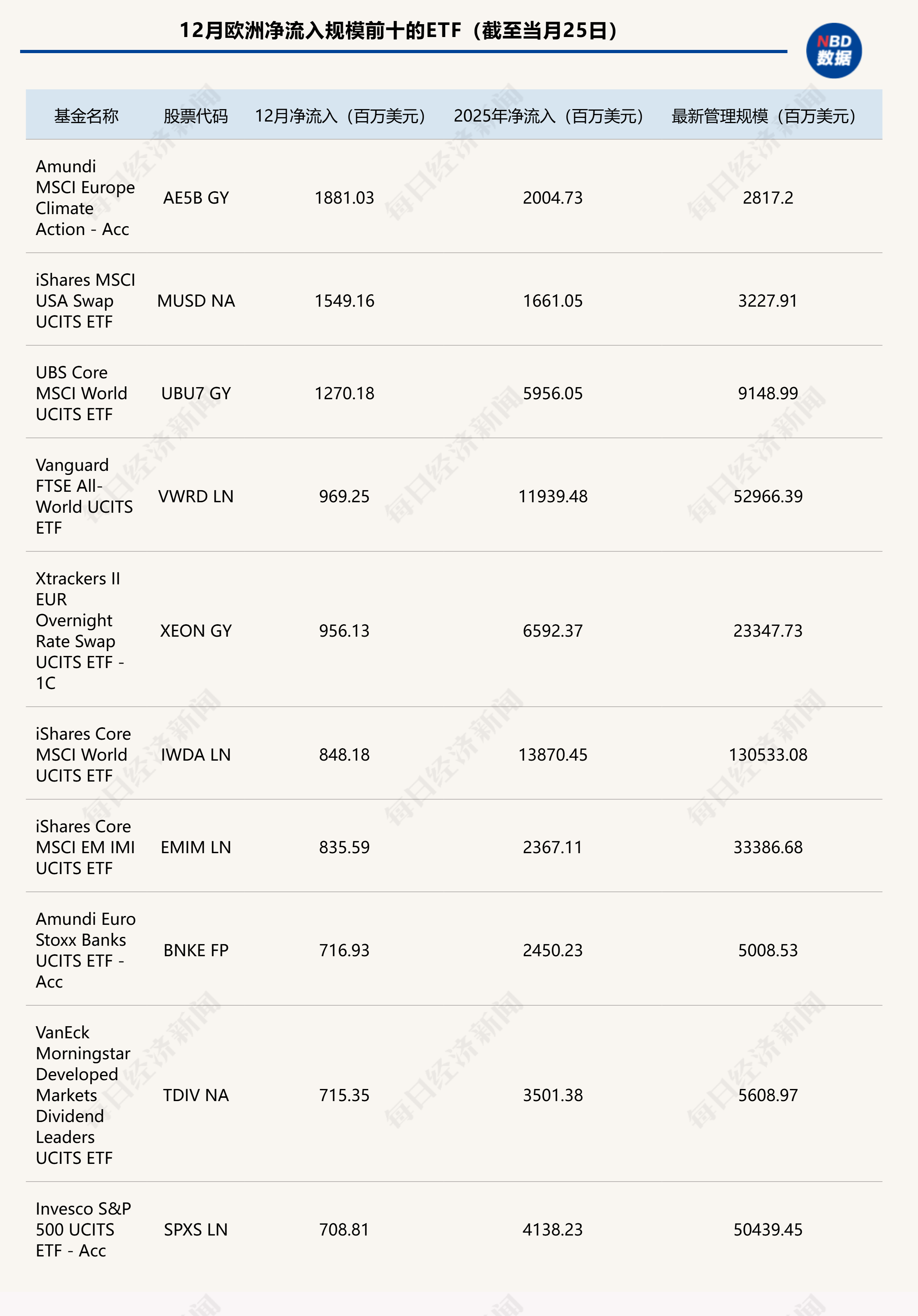 ETFGI数据还显示,12月净流入金额最多的ETF是Amundi MSCI Europe Climate Action-Acc,新增18.8亿美元。前20只净增资产最多的ETF在12月共吸引了160.1亿美元的资金流入。
