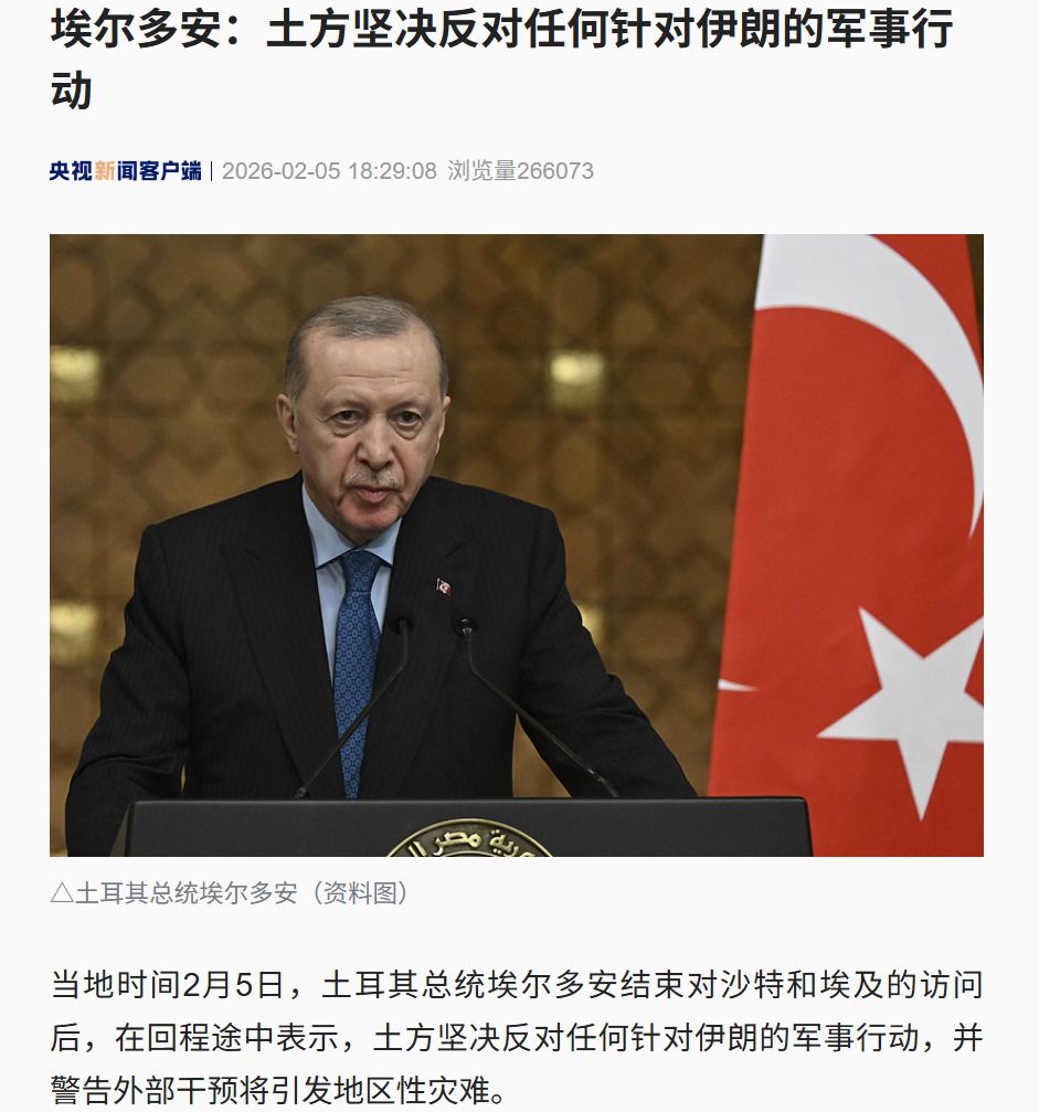 据央视新闻,当地时间2月5日,土耳其总统埃尔多安结束对沙特和埃及的访问后,在回程途中表示,土方坚决反对任何针对伊朗的军事行动,并警告外部干预将引发地区性灾难。