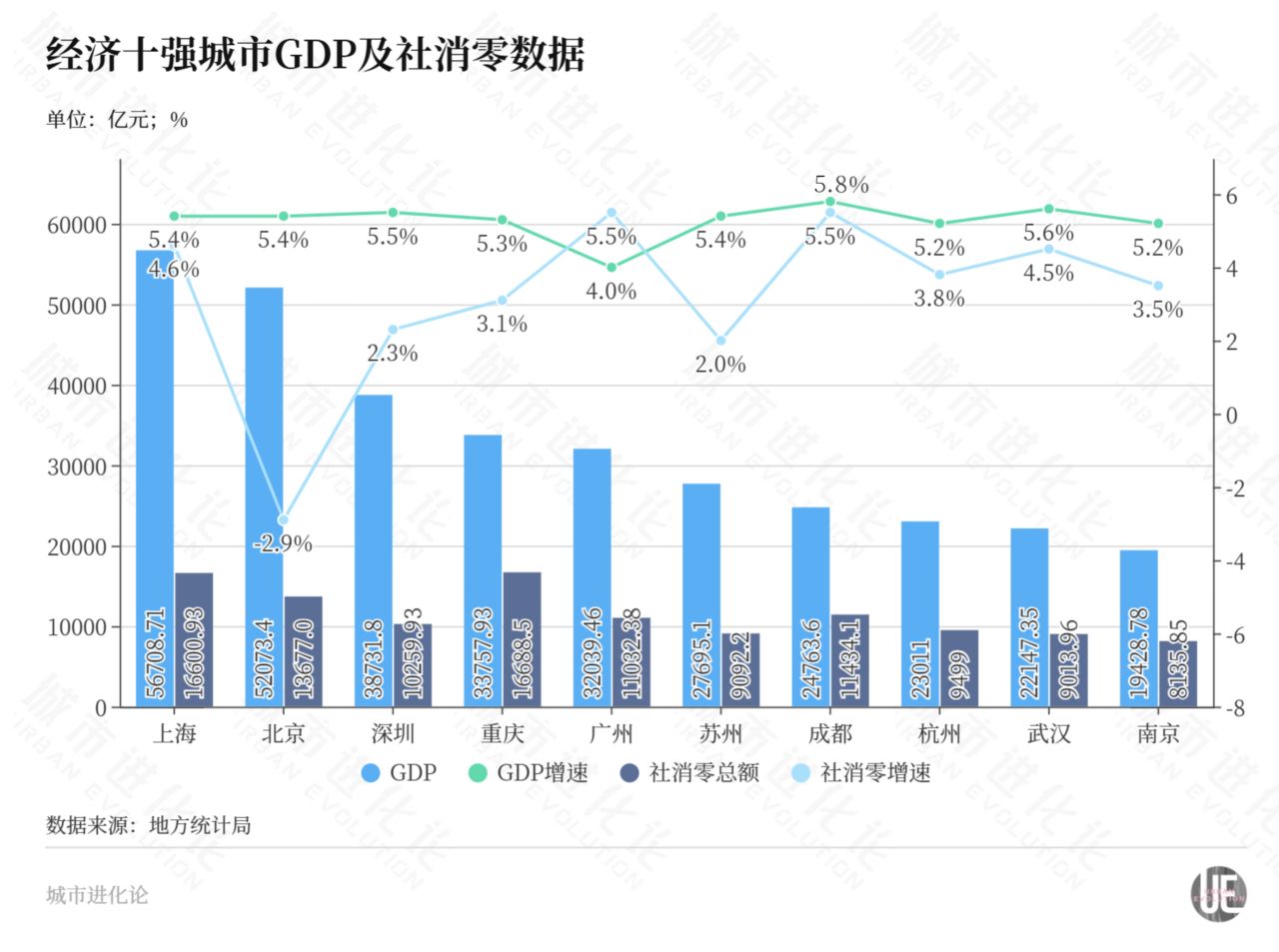 上述十强城市中,北京首次跨上五万亿台阶,成为继上海之后全国第2个五万亿元城市;深圳GDP总量达3.87万亿元,有望成为下一个四万亿元城市;成都则是以5.8%的经济增速在十强城市中实现“领跑”。