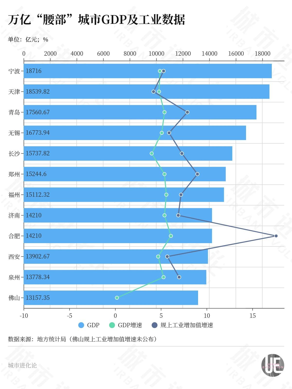 经济体量位于1.3万亿元至1.8万亿元的“腰部”城市之间竞逐更为激烈,合肥GDP增速6.1%,追平济南,经济位次较上年提升一位至第18位,取得历史最好成绩;佛山GDP增速0.2%,当前位列第22位,被西安和泉州超过。