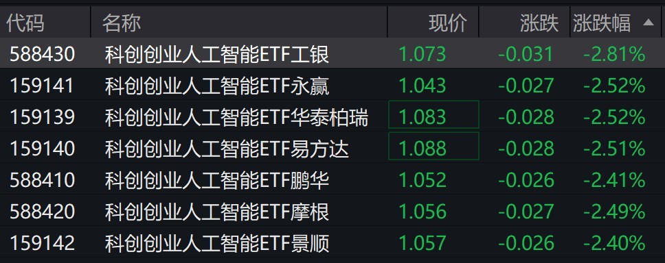 受盘面影响,科创创业人工智能相关ETF跌超2%。