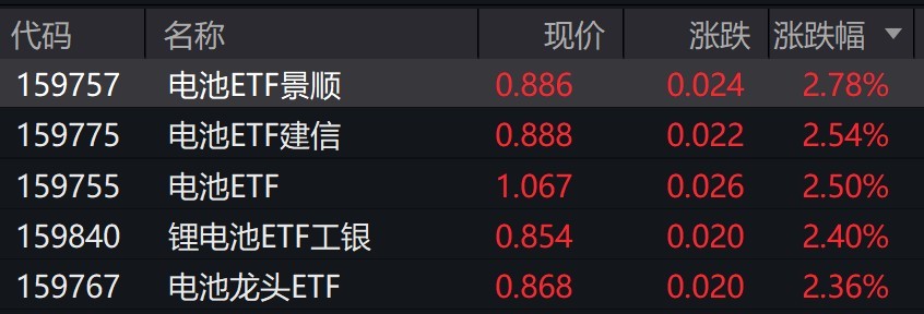 受盘面影响,电池相关ETF涨超2%。