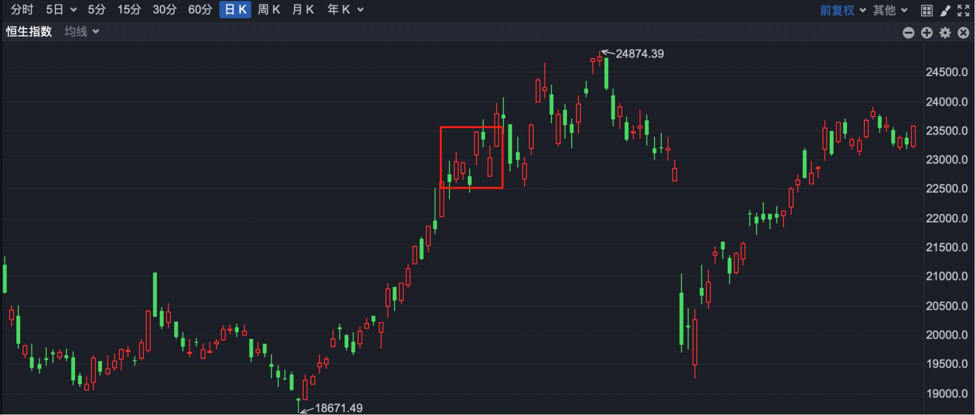 其中,春节后的2月行情,南向两次净买入超过200亿港元。当时,虽然恒指点位已经不低,达到了22000点上方,但南向爆量之后,恒指依旧维持震荡上行趋势。