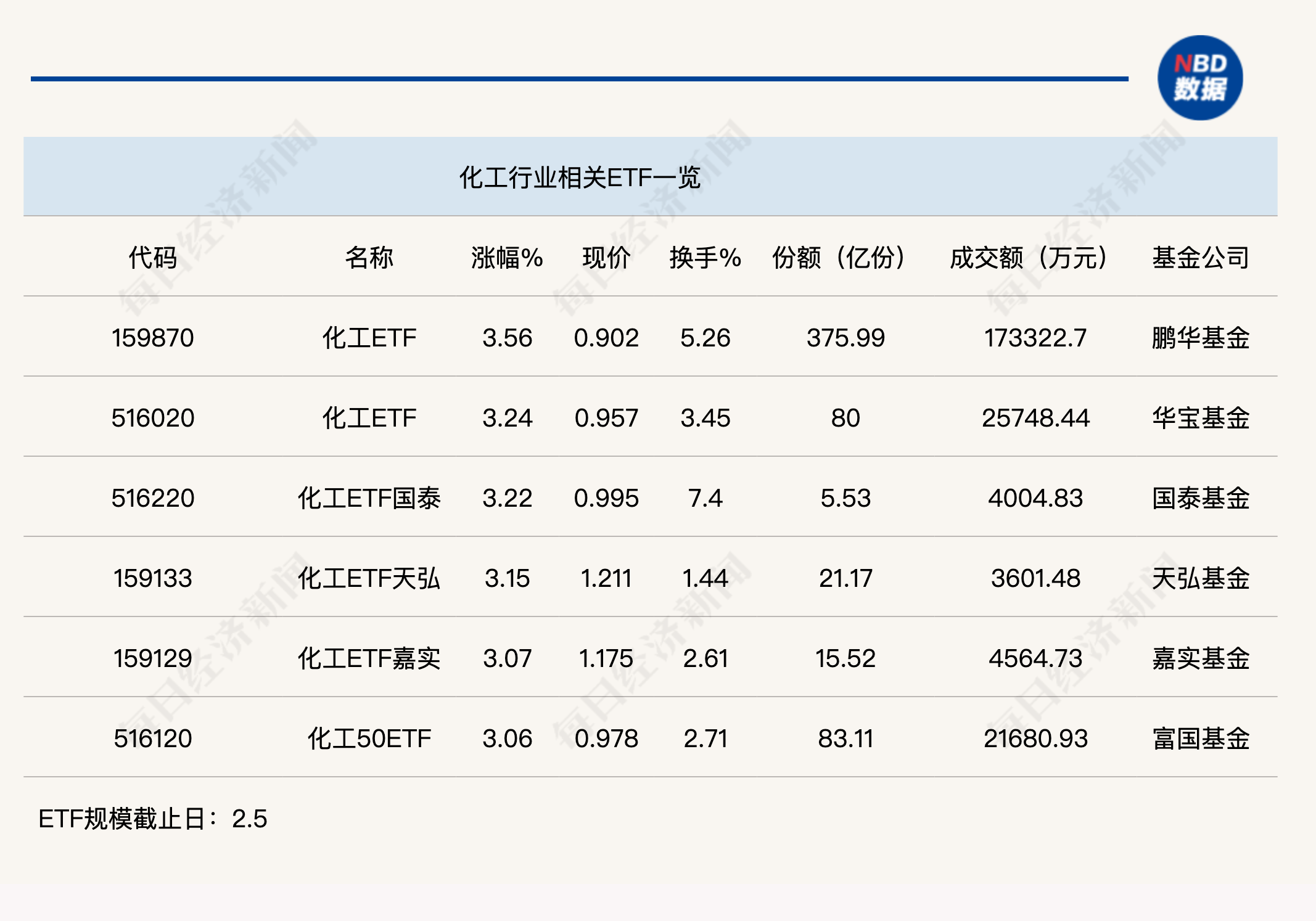 ETF涨幅榜方面,近期,还原物系分散染料的重要原料价格出现大涨,成本的上升直接推动了分散染料价格的上涨,这也为分散染料概念的上涨提供了市场基础。在分散染料概念股上涨的带动下,化工ETF今日集体大涨,6只相关ETF半日涨幅均超过3%。