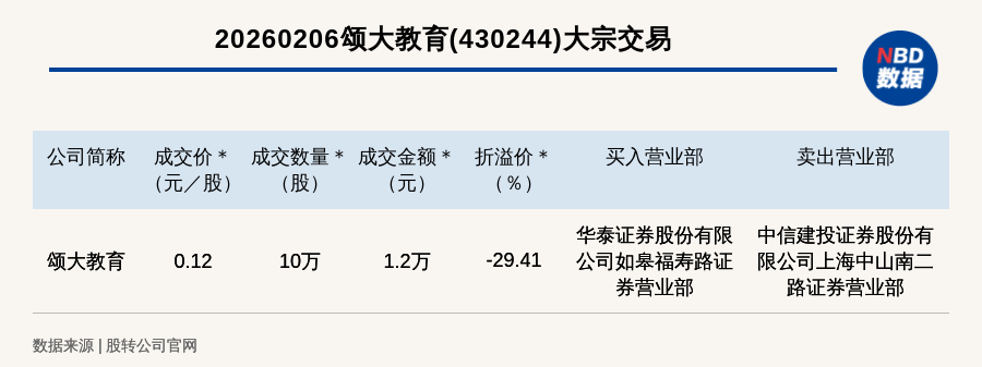 每经讯,2026年2月6日,新三板基础层公司颂大教育(430244,收盘价:0.17元)发生一笔大宗交易,成交价0.12元/股,成交数量10万股,成交金额1.2万元,折价29.41%。买入营业部是华泰证券股份有限公司如皋福寿路证券营业部,卖出营业部是中信建投证券股份有限公司上海中山南二路证券营业部。