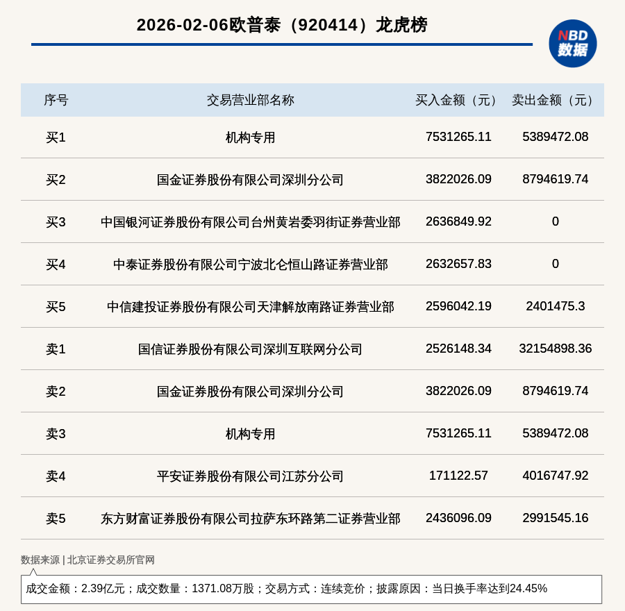 每经讯,2026年2月6日,北交所上市公司欧普泰(920414,收盘价:17.28元)登上龙虎榜,交易方式是连续竞价,披露原因是当日换手率达到24.45%,成交数量1371.08万股,成交金额2.39亿元。买一席位为机构专用,买入753.13万元;卖一席位为国信证券股份有限公司深圳互联网分公司,卖出3215.49万元。